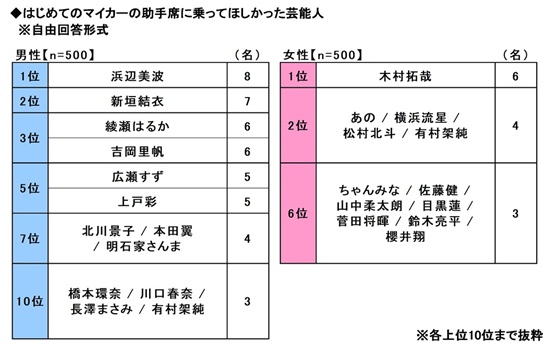 ◆はじめてのマイカーの助手席に乗ってほしかった芸能人 男性回答では1位「浜辺美波さん」、女性回答では1位「木村拓哉さん」