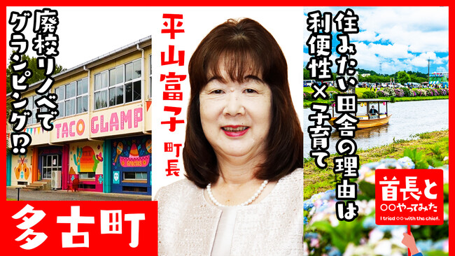 4月6日に配信開始しました、『首長と○○やってみた』では、千葉県・多古町の町長、平山富子氏が登場し、あじさいの名所・栗山川から多古町の魅力をアピールします。千葉県多古町は、成田空港に近接する立地を活かした利便性と、豊かな田園風景が広がる自然環境を併せ持つ、都市と自然のバランスが取れたまちです。ブランド米「多古米」の産地として知られ、農業を基盤に地域の魅力を発信しています。圏央道インターチェンジの整備により広域交通アクセスの向上が進み、人流・物流の活性化も期待されています。子育て支援や教育環境の充実に加え、行政のDX推進や移住支援にも取り組み、持続可能なまちづくりを進めています。