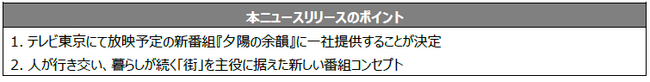 野村不動産ホールディングス株式会社(東京都港区/代表取締役社長:新井聡、以下「当社」)は、2026年4月より、テレビ東京にて新番組『夕陽の余韻』に一社提供することをお知らせいたします。