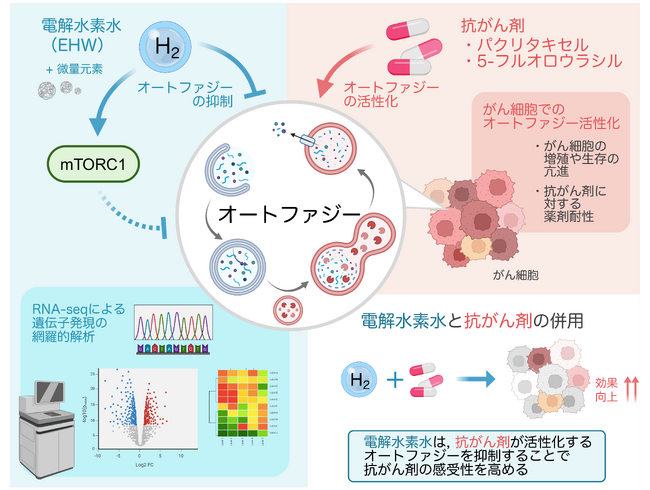 ある種のがん細胞において抗がん剤が効きにくくなる仕組みとして、がん細胞が自らを守る“細胞内成分のリサイクリングシステム「オートファジー※1」”の働きが関与することが明らかになっていました。実際、オートファジーの働きを抑えることで抗がん剤効果を高める可能性が報告されてきました。早稲田大学人間科学学術院の矢野 敏史(やの さとし)講師、原 太一(はら たいち)教授、株式会社日本トリムの樺山 繁(かばやま しげる)氏らは共同研究で、電解水素水※2が細胞の代謝制御に関わるmTORC1シグナルに関連してオートファジーを抑制し、5-フルオロウラシル※3やパクリタキセル※4に対する感受性を高める可能性をRNA-seq※5解析および細胞実験で示しました。なお、本成果は細胞実験に基づくものであり、患者における有効性、安全性、副作用軽減、推奨摂取法を示すものではありません。
