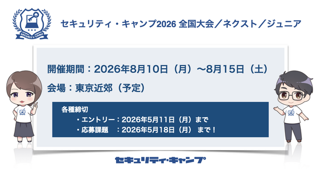 次代を担う日本発で世界に通用する若年層の情報セキュリティ人材を発掘・育成することを目指す一般社団法人セキュリティ・キャンプ協議会は、「セキュリティ・キャンプ2026 全国大会/ネクスト/ジュニア」を、2026年8月10日(月)~8月15日(土)までの5泊6日、東京近郊(予定)にて開催することを決定しました。これに伴い、2026年5月11日(月)まで参加者のエントリー受付を実施します。
