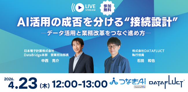 株式会社DATAFLUCT(本社所在地:東京都渋谷区、代表取締役CEO:久米村 隼人、以下DATAFLUCT)は、日本電子計算株式会社と共同で、無料オンラインセミナー「AI活用の成否を分ける“接続設計” データ活用と業務改革をつなぐ進め方」を、2026年4月23日 (木)12:00より開催します。