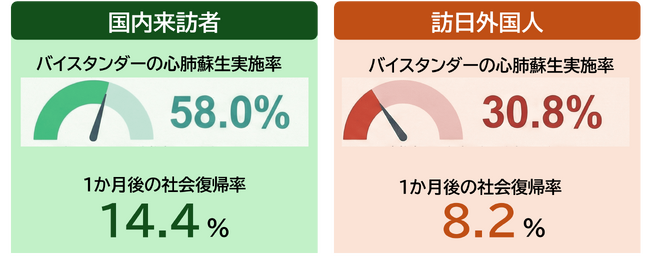 本研究により、日本における院外心停止の救命率が、来訪者の属性によって異なる可能性が示されました。特に訪日外国人では、言語や文化の違い、周囲の人との関係性の希薄さなどが、バイスタンダーによる救命処置に影響している可能性があります。
