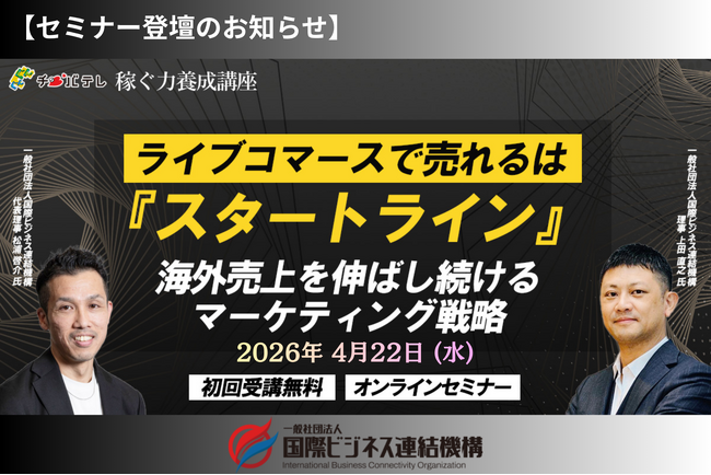 日本企業の海外進出を「知識・人脈・きっかけ」の3つの軸で支援する一般社団法人国際ビジネス連結機構(所在地:東京都港区、代表理事:松浦 啓介、以下「当機構」)は、2026年4月22日(水)に開催される、千葉テレビ放送(チバテレ)が主催するオンラインセミナー「チバテレ 稼ぐ力養成講座」において、代表理事・松浦 啓介および理事・上田 直之が登壇することをお知らせいたします。