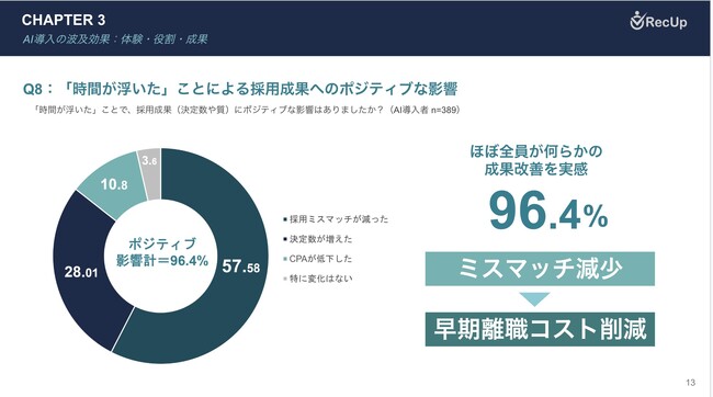 [画像4: https://prcdn.freetls.fastly.net/release_image/61059/40/61059-40-4f702d3b47eb6e99084a403010009317-1938x1078.jpg?width=536&quality=85%2C75&format=jpeg&auto=webp&fit=bounds&bg-color=fff ]AIによって生まれた時間の使い道として、半数以上の担当者が「候補者と向き合う時間の増加」を挙げました。 その結果、AI導入者の約9割が「候補者とのコミュニケーション品質の向上」を実感しており 、具体的な成果として「採用ミスマッチの減少(57.58%)」につながっていることが実証されました。