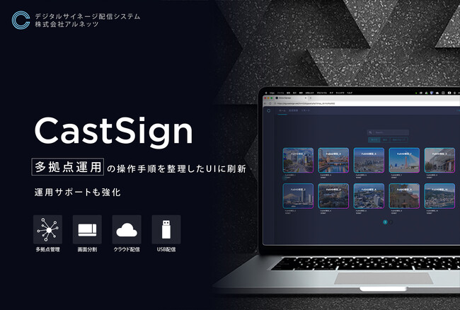 株式会社FRONTEO(東証グロース:2158)のグループ企業である株式会社アルネッツ(本社:神奈川県横浜市、代表取締役社長CEO 渡邉 輝明、以下「アルネッツ」)は、デジタルサイネージ配信システム「CastSign(キャストサイン)」のUIデザインを全面的にリニューアルし、あわせてヘルプサイトの提供を開始しました。