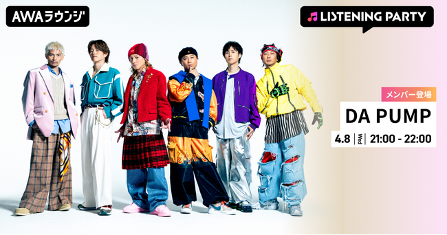 AWA株式会社(本社:東京都港区、代表取締役CEO:冨樫晃己)が運営する、サブスクリプション型(定額制)音楽ストリーミングサービス「AWA(アワ)」は、2026年4月8日(水) 21:00~22:00にて、無料で誰でも参加できるオンライン空間「AWAラウンジ」で、DA PUMPのメンバーがリアルタイムで登場するリスニングパーティーを開催いたします。