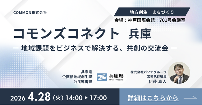 COMMON株式会社(本社:京都市、代表取締役:増田勇樹)は、2026年4月28日、神戸市内にて、地域課題をテーマにした共創交流会「コモンズコネクト」を兵庫で初開催いたします。
