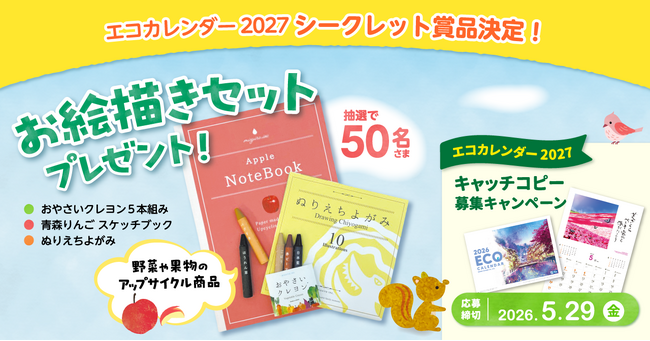 完成したカレンダーを応募者全員にプレゼントするほか、キャンペーンにご参加いただいた方へのプレゼント(特別賞・抽選で50名)として「シークレット賞品」をご用意しています。今年の「シークレット賞品」はアップサイクル文具を含む「お絵描き3点セット」(おやさいクレヨン、青森りんご スケッチブック、ぬりえちよがみ)に決定しました!
