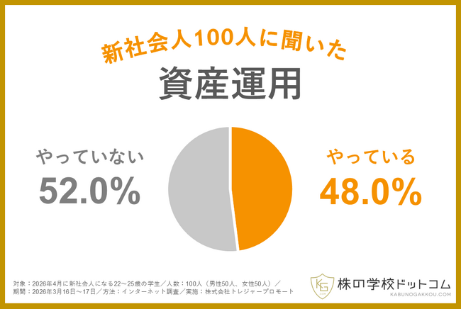 オンライン株式スクール「株の学校ドットコム」(運営会社:株式会社トレジャープロモート、東京都千代田区、代表取締役社長:瀬川 丈)は、この4月に新社会人となる学生100人を対象に、資産運用に関する実態調査を行いました。