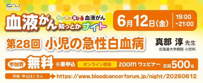 認定NPO法人キャンサーネットジャパン(東京都文京区 理事長 岩瀬 哲)は、2023年より毎月1回、血液がんに関するオンラインセミナー「血液がん知っとかナイト」を実施しています。28回目の開催となる2026年6月は「小児の急性白血病」をテーマに開催する運びとなりました。本セミナーはレモネードスタンド開催による寄付の一部を活用して開催させていただきます。