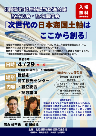 舞鶴市、舞鶴市議会、舞鶴商工会議所が連携し、北陸新幹線舞鶴ルートの誘致を推進する新組織を設立。令和8年4月29日に設立総会と石丸修平氏・東博暢氏による記念講演会を実施します。