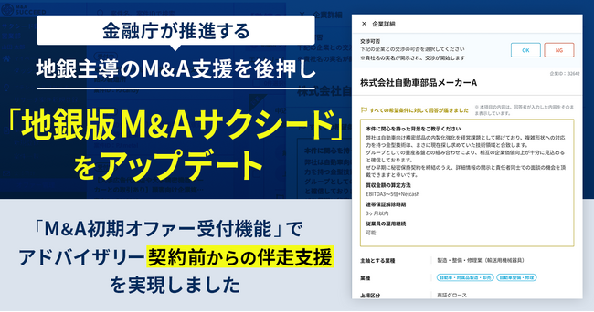 Visionalグループの株式会社M&Aサクシード(所在地:東京都渋谷区/代表取締役社長:金 蓮実)が運営する法人限定M&Aプラットフォーム「M&Aサクシード」(https://ma-succeed.jp/)は、地域金融機関向けに提供している「地銀版M&Aサクシード」をアップデートし、2026年4月7日より新たに「M&A初期オファー受付機能」の提供を開始いたします。