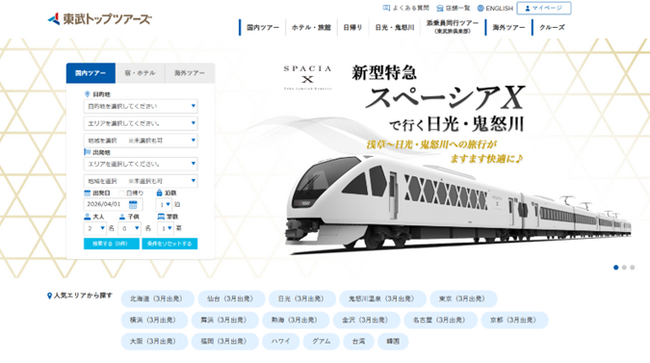 東武トップツアーズ株式会社(本社:東京都墨田区、代表取締役社長:百木田康二)は、2026年4月以降に出発する旅行商品の発売を開始するとともに、新商品の発売に合わせ、「より便利でお得な旅を」をというコンセプトのもと、当社の旅行予約サイトを全面リニューアルいたしましたのでお知らせいたします。