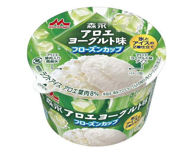 このたび発売する「森永アロエヨーグルト味フローズンカップ」は、発売から30年以上続くロングセラーブランド「森永アロエヨーグルト」の爽やかな味わいを、氷とアイスの2つの食感で楽しめる春だけでなく夏にもぴったりのカップアイスです。つぶつぶのアロエ葉肉が入ったなめらかな微細氷と、ヨーグルトらしいほのかな酸味と爽やかなコクが特長のアロエヨーグルト味のアイスを層状に仕立てた二層構造により、スイーツ氷のような贅沢な味わいをお楽しみいただけます。