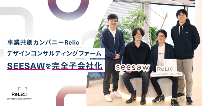 事業共創カンパニーである株式会社Relic(本社:東京都渋谷区、代表取締役CEO:北嶋貴朗/ 代表取締役CTO:大庭亮)は、新規事業開発とブランディングに特化したデザインコンサルティングファームとして国内外から高い評価を受ける株式会社SEESAW(本社:東京都渋谷区、代表取締役:村越陽平、以下「SEESAW」)を完全子会社化したことをお知らせします。