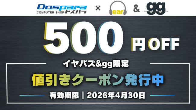 【4/30(木)まで】「イヤバズ限定ドスパラ通販クーポン」配信開始|税込10万円以上の新品PCが500円OFFに