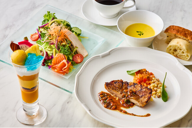 食事はじめの前菜では、ケールや低カリウムレタスなどの野菜、豆、キヌアなど身体に優しい食材をたっぷりと使い、蒸し鶏、サーモンを合わせた盛りだくさんのサラダを、自家製の野菜すりおろしドレッシングでお召し上がりください。メイン料理はパスタ2種類、魚・肉のグリル4種類の計6種類からその日の気分でお好きなものをお選びいただけます。パスタはそれぞれ旬のあさりとしらすを使ったメニューをご用意いたします。魚のグリルは香ばしく焼き上げた鯛にレモンやオレガノ、トマト、オリーブオイルをベースにした 爽やかな風味のサルモリーリオソースを合わせ、軽やかな味わいに仕上げました。肉のグリルは鶏肉と牛肉をご用意し、鶏肉は青唐辛子を効かせたバルサミコソースで、牛サーロインと牛フィレは旨みが凝縮された濃厚なグレイビーソースでご堪能いただけます。締めくくりのデザートは、初夏の雰囲気に合わせ南国リゾートをイメージしたトロピカルフルーツをふんだんに使用したパフェをご賞味ください。ブルーキュラソーのジュレを添えて、見た目も味わいも涼やかな心弾むひとときをお楽しみください。[画像4: https://prcdn.freetls.fastly.net/release_image/30117/2346/30117-2346-13cfed0d8e6f20d7eb03805f011bacd9-600x400.jpg?width=536&quality=85%2C75&format=jpeg&auto=webp&fit=bounds&bg-color=fff ]