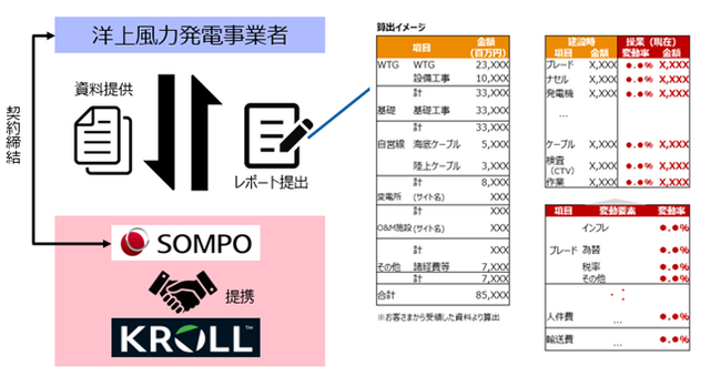 算定にあたっては、インフレ指数、国際的な設備単価データ、為替動向、税制の変化などを反映し、現在の市場環境を踏まえた評価を行います。グローバルで洋上風力発電所の評価実績を有するKROLL※と提携し、その知見と損保ジャパンおよびSOMPOリスクの専門性を組み合わせることで、信頼性の高い評価を実現します。