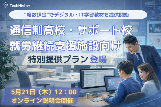 10代向けデジタル人材育成サービス「TechHigher」を運営する株式会社エクシード(本社:東京都渋谷区、代表取締役:澤部愛子)は、通信制高校・サポート校および就労継続支援施設向けに、運営実態に合わせて設計した「デジタル・IT学習教材 特別提供プラン」を2026年4月より提供開始します。