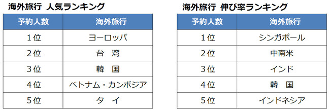 前年比の伸び率では、1位 シンガポール、2位 中南米、3位 インドの順となりました。首位のシンガポールでは、航空機で現地に移動し、クルーズ客船で周辺を巡る「フライ&クルーズ」が支持を集めています。2位の中南米では、8日間~10日間の周遊ツアーが好調です。長距離移動を伴うことから、ビジネスクラスやプレミアムエコノミークラスの需要も伸びています。