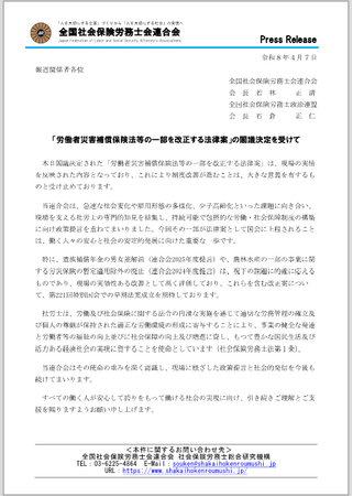 全国社会保険労務士会連合会(会長:若林 正清)は、2026年4月7日、「労働者災害補償保険法等の一部を改正する法律案」が閣議決定されたことを受け、全国社会保険労務士政治連盟(会長:石倉 正仁)との連名で声明を公表した。