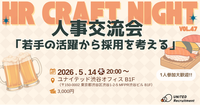 ユナイテッド株式会社(本社:東京都渋谷区、代表取締役社長 兼 執行役員:早川 与規、証券コード:2497)の連結子会社であるユナイテッド・リクルートメント株式会社(本社:東京都渋谷区、代表取締役:金子 陽三)は、これまで46回にわたりスタートアップから大手企業まで幅広い企業人事の皆さまに向けて、HR領域の知見共有・交流を目的に、「寿司とクラフトビールで仲間を作る」をテーマにした人事交流イベント「HR Craft Night」を開催してまいりました。