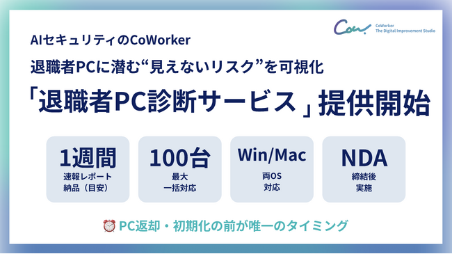 AIセキュリティソリューションを開発・提供するCoWorker株式会社(本社:東京都新宿区、代表取締役:山里一輝、以下「当社」もしくは「CoWorker」)は、退職者が使用していたPCを対象に、情報持ち出しや内部不正の痕跡を可視化する「退職者PC診断サービス」の提供を開始しました。