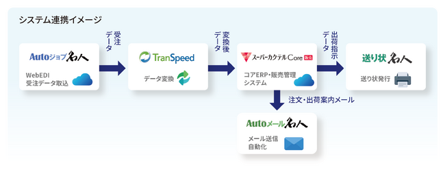 坂謙では、「Autoジョブ名人」「Autoメール名人」「送り状名人」「TranSpeed」を活用し、受注から出荷に至る一連の業務フローを改善しました。まず、ワークショップやホームセンターの各種WebEDIから受ける注文データ処理を、「Autoジョブ名人」と「TranSpeed」で自動化。基幹システム「スーパーカクテルCore」と連携し、仕分けリストやピッキング予定データ、入荷予定データの作成を効率化したことで、出荷までのリードタイム削減につながっています。