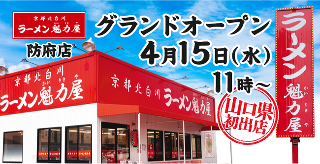 京都北白川ラーメン魁力屋をチェーン展開する株式会社魁力屋(https://corp.kairikiya.co.jp/本社:京都市中京区、代表取締役社長:藤田 宗、以下魁力屋)は、2026年4月15日(水)に「京都北白川 ラーメン魁力屋 防府店」を山口県防府市にグランドオープンいたします。