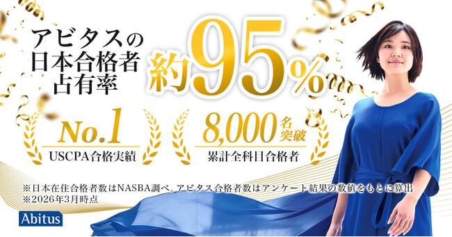 国際資格の専門校、株式会社アビタス(本社:東京都渋谷区、代表取締役:宇坂純)は、2024年に実施されたUSCPA(米国公認会計士)試験において、日本在住の全合格者に占める自社受講生の割合が95.4%(※)に達したことを発表いたします。