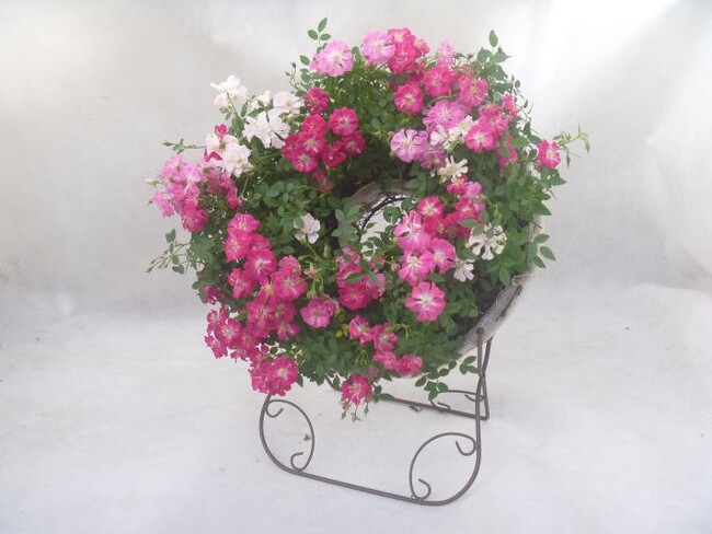 ウェルカムローズとは、赤、ピンク、白のレンゲローズをリース状に仕立て、イーゼルに飾ったギフト用、鑑賞用のバラの寄せ植えです(下記写真参照)。