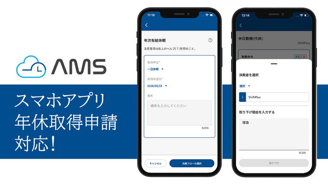 シフトプラス株式会社(代表取締役:中尾 裕也、本店:宮崎県都城市宮丸町3070番地1/本社:大阪府大阪市西区江戸堀2丁目1番1号 江戸堀センタービル8階/以下シフトプラス)は、自治体職員勤怠管理システムである「AMS」のスマートフォンアプリにおいて、新たに「年休取得申請機能」および「取り下げ機能」をリリースしたことをお知らせいたします。