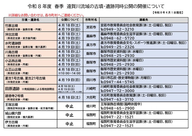 直方市では、遠賀川流域の5市3町が連携し、地域に残る貴重な歴史資源である古墳を同時公開するイベントを開催します。悠久の時を経て現代に伝わる古墳や横穴墓を公開し、各自治体の文化財担当職員が現地で解説を行います。