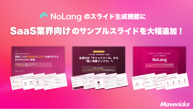 株式会社Mavericksは、動画生成AI「NoLang」のスライド生成機能において、SaaS・プロダクト企業向けのサンプルスライドを公開。営業・マーケ・IRの資料作成を一気通貫で効率化