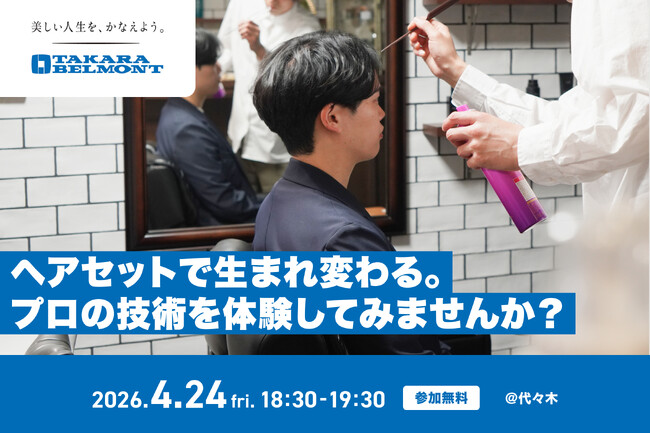 会員数100万人超、「今月行ける婚活パーティー・街コン」掲載数日本No.1※の婚活情報サイト運営や、全国自治体の恋活支援を行う株式会社オミカレ(本社:東京都渋谷区、代表取締役社長:久留宮 雅仁、以下「オミカレ」)は2026年4月24日(金)、理美容機器・理美容専売化粧品の製造販売を手掛けるタカラベルモント株式会社(本社:大阪市中央区、代表取締役会長兼社長:吉川秀隆、以下タカラベルモント)と共同で、「自分らしく、ちょっとカッコいい自分へ。」をテーマとする婚活男性向けヘアセット1Dayワークショップを開催いたします。