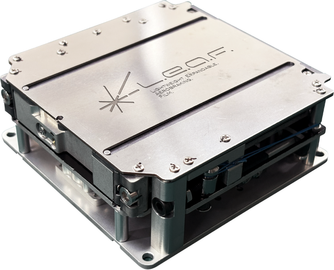 「LEAF」は、Lightweight Expandable Aerobraking Filmの略称であり、軽量かつ展開可能な膜構造により、大気抵抗を利用して衛星の軌道離脱を促進するコンポーネントです。●収納時0.3U(82mm × 82mm × 30mm)の高い収納効率
