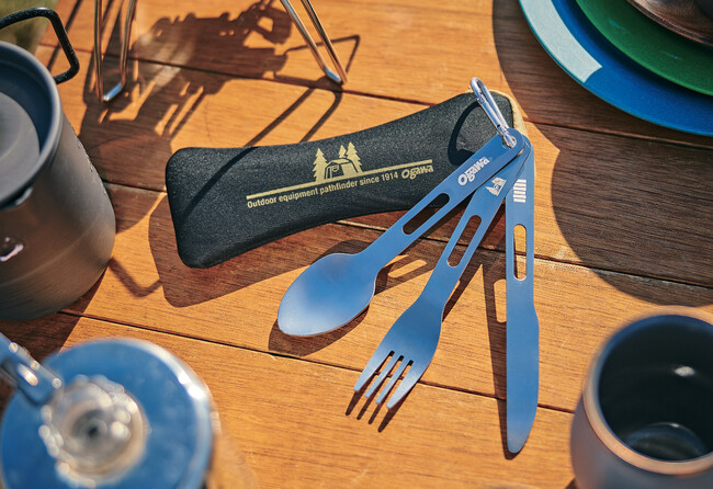 フォークにはogawaのシンボル “オーナーロッジ” のイラストロゴが。『オーナーロッジ1号』は日本初のロッジテントで、1961年に発売された。