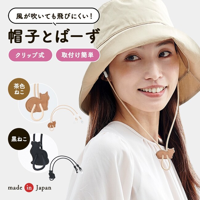 クリップで挟むだけの簡単取り付け!外れにくいクリップで、風で帽子が飛ぶのを防いでくれる帽子ストッパーです。かわいいねこのストッパーでサイズ調節が可能。帽子のツバやビンカワにあご紐のように取り付けたり、帽子のツバと洋服に取り付けたりと、取り付け方もいろいろ!