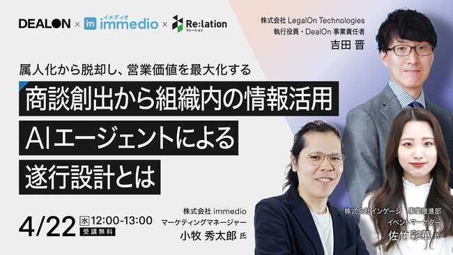 株式会社immedio(本社:東京都渋谷区、代表取締役:浜田 英揮)は、2026年4月22日(水)、株式会社LegalOn Technologies、株式会社インゲージと共に、営業組織の属人化を排除し、再現性のある成果創出を実現するためのオンラインセミナーを開催いたします。