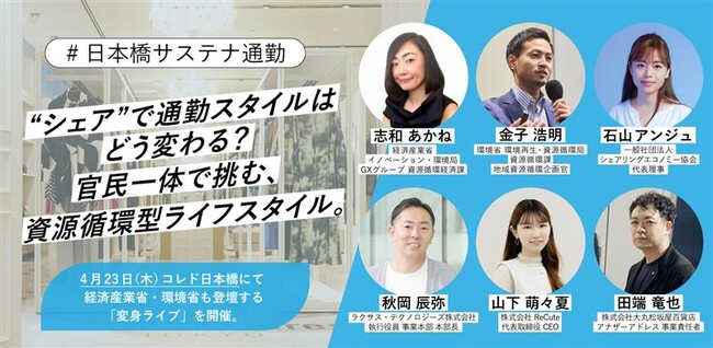 本イベントでは、経済産業省・環境省、および日本橋エリアのまちづくり関係者が登壇し、ファッションや美容家電のシェアリングが「日常の選択肢」としてどのように定着し、脱炭素社会(デコ活)や資源循環の推進にどのように貢献するのかを、トークセッションと実演を通じて紹介します。