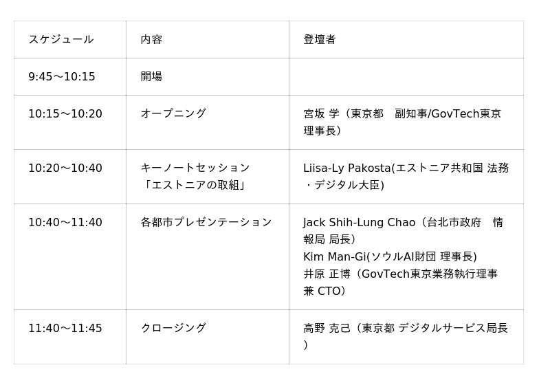 後半のセッションでは、「行政×AI」をテーマに、台北市他、ソウルAI財団、GovTech東京が登壇。各都市におけるAI活用の戦略や具体的な取組、これまでの成果と今後の課題についてプレゼンテーションを行います。