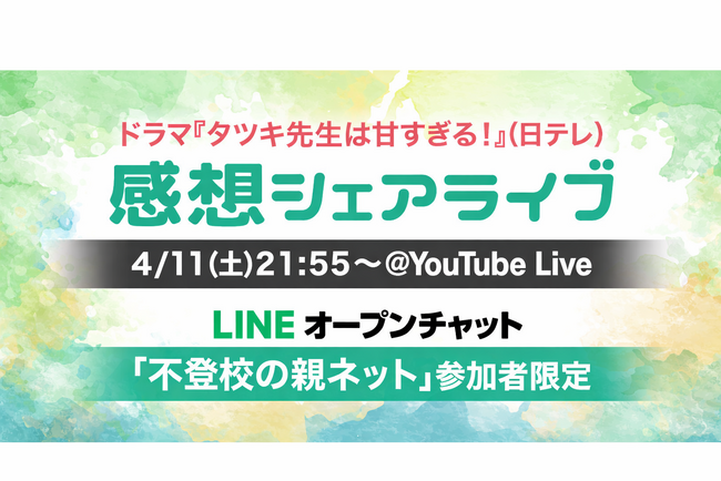 ドラマ『タツキ先生は甘すぎる!』感想シェアライブ開催!不登校の保護者と専門家が放送直後に語り合う特別イベント【4/11(土)21:55~@YouTube Live】