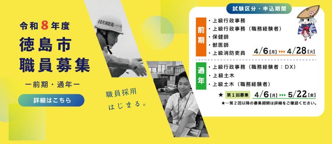 【徳島市】令和8年度徳島市職員採用試験(前期募集)(事務職・保健師・獣医師・消防吏員 令和9年4月1日採用予定分) 申込受付開始しました!