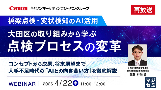 マジセミ株式会社は「【再放送】<橋梁点検・変状検知のAI活用>大田区の取り組みから学ぶ点検プロセスの変革」というテーマのウェビナーを開催します。