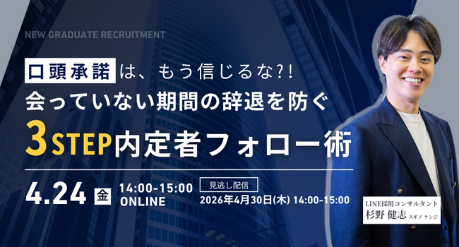 タイトル:口頭承諾はもう信じるな?!「会っていない期間」の辞退を防ぐ3ステップ内定者フォロー術開催日 :2026年4月24日(金) 14:00-15:00