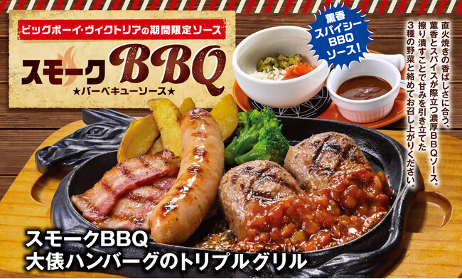 株式会社ビッグボーイジャパン(代表取締役社長:平山 賢太郎 本社:東京都港区)が展開するハンバーグ&ステーキレストラン「ビッグボーイ」「ヴィクトリアステーション」は、4月16日(木)より、看板メニュー“大俵ハンバーグ”を新たな食べ方でお楽しみいただける、「スモークBBQ大俵ハンバーグのトリプルグリル」を新発売します。