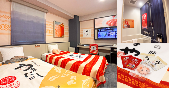 「やまやコラボルーム」は、九州の食文化とその魅力を世界へ発信する、やまやコミュニケーションズの、『やまやの辛子明太子』をご堪能いただける、明太子づくしの客室です。ベッドや壁を、おなじみの辛子明太子のパッケージや、辛子明太子の写真、明太子のキャラクター「やまや めんたいちゃん」で装飾しました。ご宿泊のお客様には、やまやの人気商品である、”うま”さにこだわり6種類の厳選だし素材を黄金比率でブレンドした「飲むうまだしスープ1包入」、漬け込み液「匠のたれ」に使われている4つの素材をイメージし、トウガラシエキスやマコンブエキスが入った入浴料「おふろで明太子気分入浴料」、「やまや めんたいちゃん」のキーホルダーをプレゼントします。価格は、朝食付き18,000円~(1室1泊、税サ込)