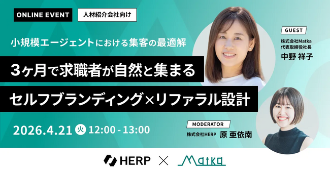 本セミナーでは、人材紹介企業の業績向上を支援する株式会社Matka 代表取締役・中野祥子氏が登壇。リファラルを軸にした集客設計で年間1,200名の集客を実現した実践知をもとに、小規模エージェントが明日から使える具体的なノウハウをお届けします。