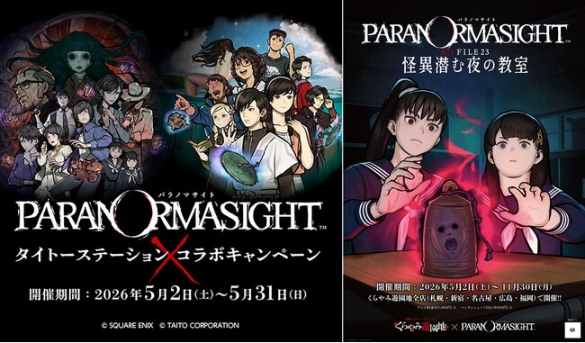 株式会社タイトー(本社:東京都新宿区、以下タイトー)は、株式会社スクウェア・エニックスのホラーミステリーADV「パラノマサイト FILE23 本所七不思議」、青春群像伝奇ミステリー「パラノマサイト FILE38 伊勢人魚物語」との期間限定コラボイベント/コラボキャンペーンを2026年5月2日(土)より、全国の「タイトーステーション」「地獄のタイトーステーション くらやみ遊園地」、タイトーステーションに併設するクレープ店、EXBAR TOKYO plus全店にて開催いたします。※1